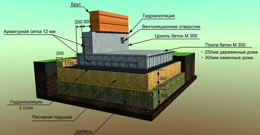 При возведении основания предварительно выравнивается участок и готовится углубление (котлован). Его высота составляет в среднем 25 см. Затем, укладывается слой из гравия и песка, гидро- и пароизоляция. После этого нужно установить опалубку, каркас из арматуры и залить бетонную смесь. Чтобы основание выдерживало нагрузку обязательно после заливки раствора удаляют пузыри воздуха.