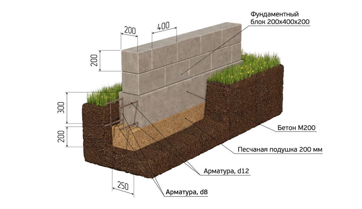 С целью выравнивания дна фундаментной траншеи либо котлована, засыпается слой песка или гравия высотой десять сантиметров. В местах, где планируется расширение стен, применяется бетонирование. Этот же вариант с бетонной подушкой используют, когда планируется строительство ленточного фундамента с армированными сваями из блоков ФБС.