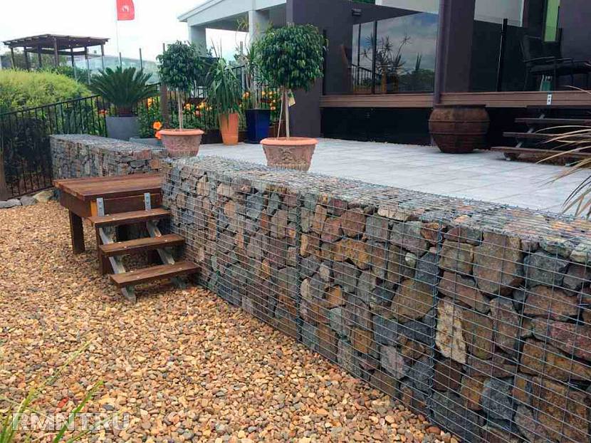 Коробчатыми габионами с камнями иногда ограждают клумбы в южных странах