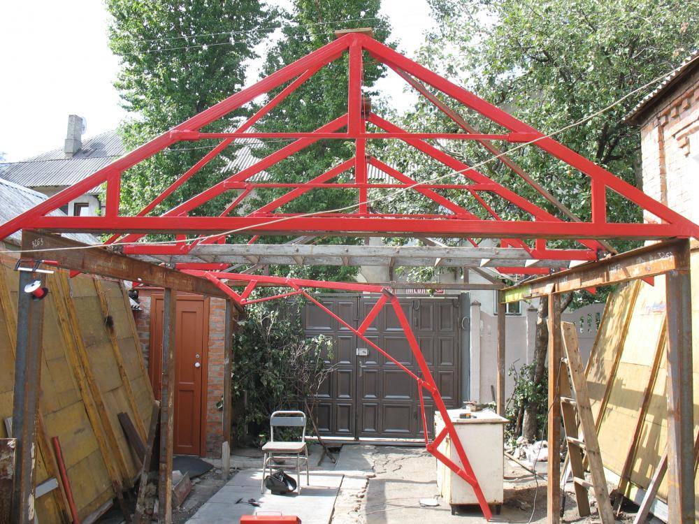 Каркас для неё проще варить на земле, важно разметить первую стропильную форму в виде равнобедренного треугольника и укрепить её перемычками
