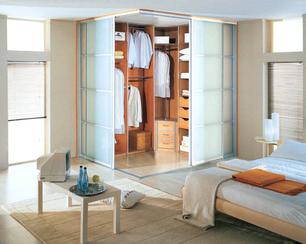 Для того чтобы сделать угловую гардеробную своими руками можно использовать радиусные двери. У этих моделей створки раздвигаются в стороны по изогнутой составляющей, имеющей форму полукруга. Это позволяет несколько расширить пространство гардеробной небольшой площади.