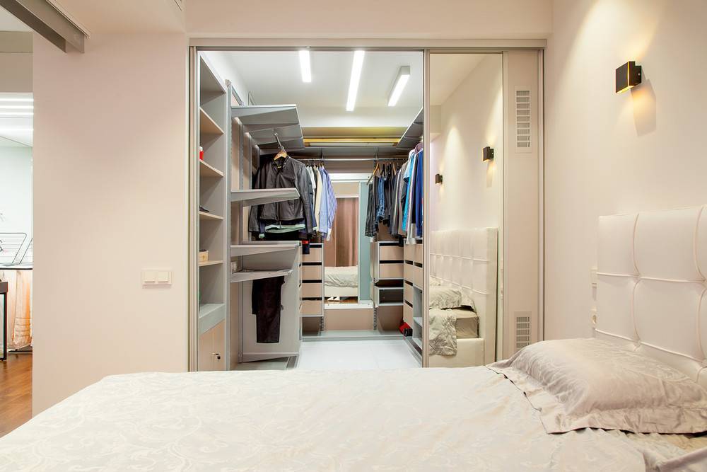 Закрытая гардеробная располагается в отдельной комнате или нише, которая отгораживается москитной сеткой или дверцей купе.