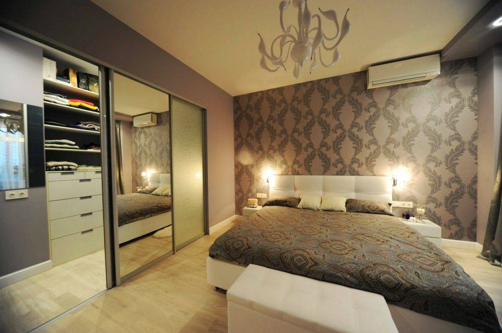 Оборудовать комнату для одежды и аксессуаров проще в вытянутой спальне. Но если нет возможности использовать много пространства, то лучшим выбором является встроенный шкаф.