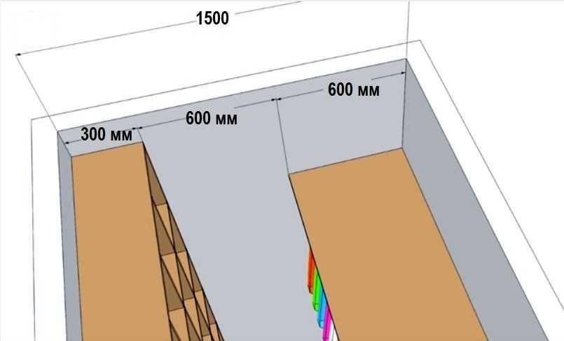 Ширина полки для штанги на 10 см больше размера плечиков, бельевые – от 20 до 40 см. Если обувь хранится без коробок, для них делаются полки до 40 см, для сапог выделяется индивидуальное отделение с высотой до 60 см.