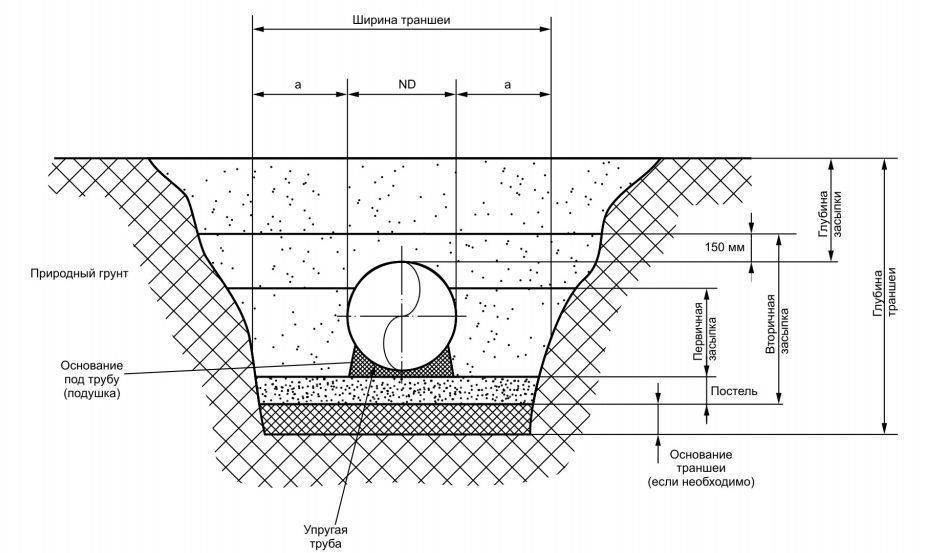 Способ затратный. Трубы укладывают на глубину ниже уровня промерзании земли – не менее 0,8 м. В холодных регионах глубина траншеи увеличивается до 1,2 м.