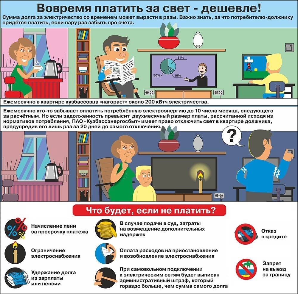 Электроэнергия — такая же услуга, за которую человек должен платить. В случае игнорирования оплаты могут последовать не самые лучшие последствия, которых можно избежать при своевременном погашении долга. Долг не всегда возникает в связи со злостной неуплатой, поэтому не стоит забывать периодически проверять состояние лицевого счета.