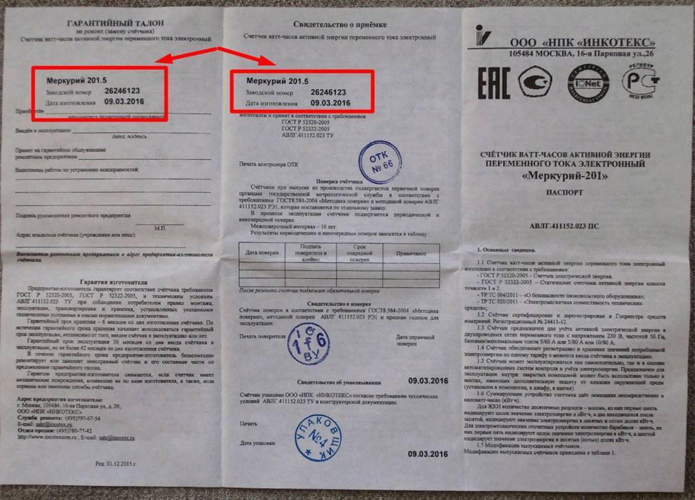 Как и любое другое изделие, электросчётчик сопровождается от изготовителя паспортом – основным документом, содержащим описание конструктивных и эксплуатационных особенностей аппарата. Кроме прочей информации, паспорт содержит указание серийного номерного знака, обычно проставленного в документе специальным штампом на одной из начальных страниц.