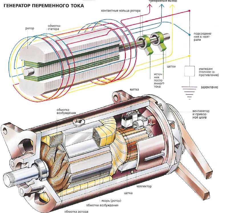 Так вот если говорить о трехфазных генераторах переменного тока, то это три вот таких однофазных. Только трехфазный агрегат имеет обмотку не на роторе (валу), а в статоре. И таких обмоток три, которые сдвинуты относительно друг друга по фазе. Вал, как и в первой конструкции, выполняет функции электромагнита, который питается через контакты скользящего типа постоянным током.