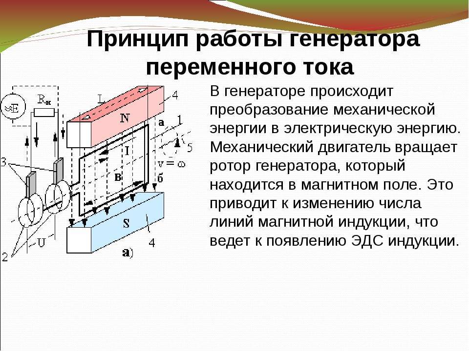 Любой генератор действует по электромагнитному индуктивному закону, благодаря наводке электротока в замкнутой рамке пересечением вращающегося магнитного поля, создаваемое с помощью постоянных магнитов или обмоток. Электродвижущая сила попадает в замкнутый контур из коллектора и щеточного узла вместе с магнитным потоком, вращается ротор и вырабатывает напряжение. Благодаря подпружиненным щеткам, которые прижимаются к пластинчатым коллекторам, передается электроток к выходным клеммам. Далее он идет в сеть пользователя и распространяется по электрооборудованию.