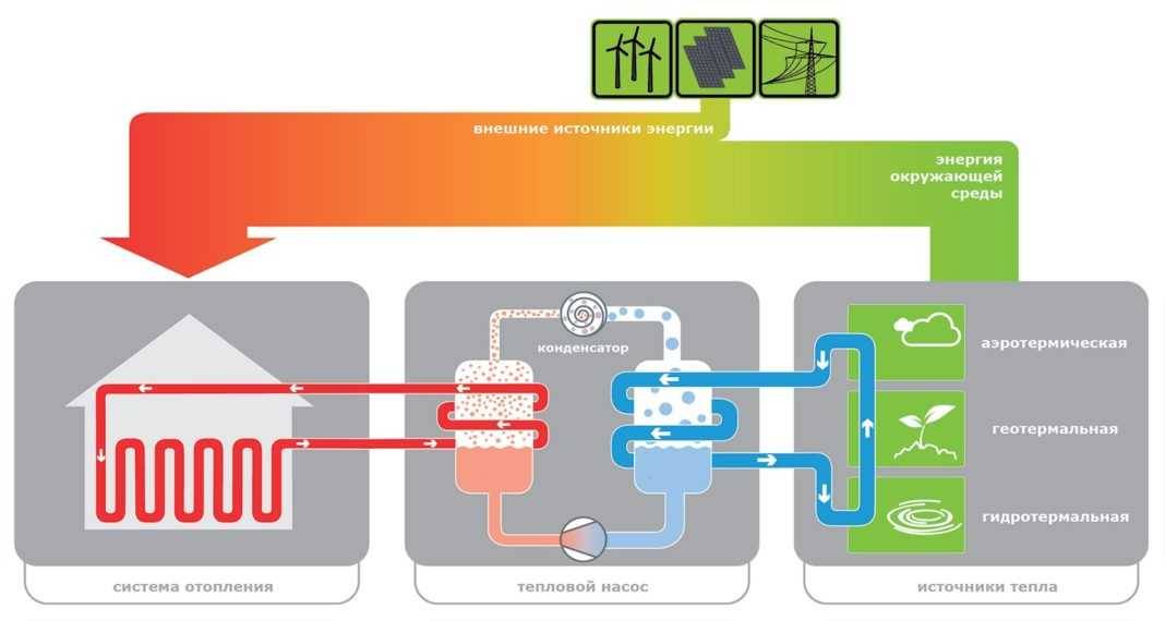 Тепловой насос состоит из компрессора и редукционного клапана, которые обеспечивают разность потенциалов на отдельных участках контура теплового насоса. Внутри труб находится фреон, который благодаря работе компрессора, получает ускорение, и проходя через клапан ускоряет своё движения. Это приводит к существенному подъёму температуры на участке перед компрессором, именно из этого участка, с помощью теплового обмена, и берётся основное тепло для обогрева помещений и горячего водоснабжения.