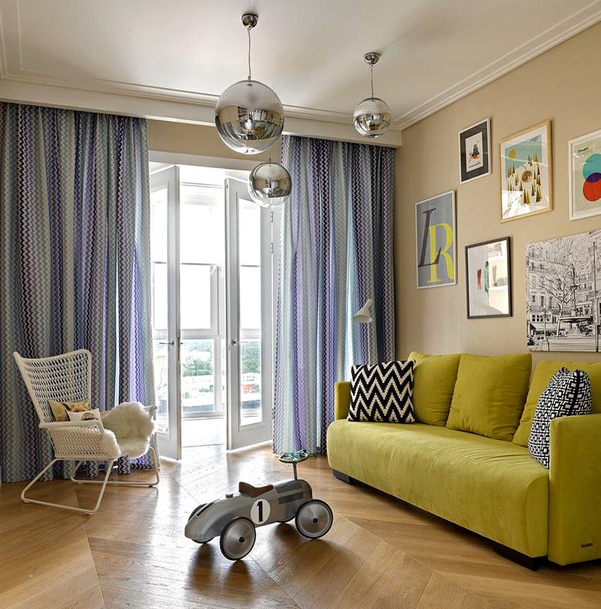 Шторы, закрепленные на потолочном карнизе, выглядят так, будто струятся из ниоткуда. Визуальный эффект не идет ни в какое сравнение с настенным монтажом. Кроме того, такой карниз помогает визуально «поднять» потолок. Поскольку элемент закрепляется сверху, стена кажется более длинной, чем в реальности. Это отличное дизайнерское решение для типичного старого жилого фонда с высотой стен 2.5-2.7 метров.