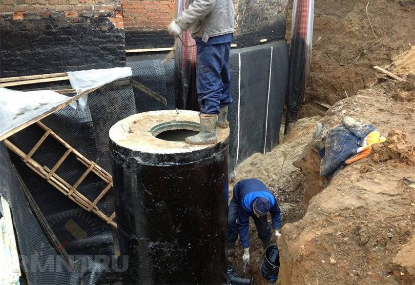 Наружная гидроизоляция проводится по всей высоте до верхнего края колодцев. При засыпании ямы используют песчано-гравийный состав, смешанный с грунтом, который в процессе тщательно утрамбовывают.
