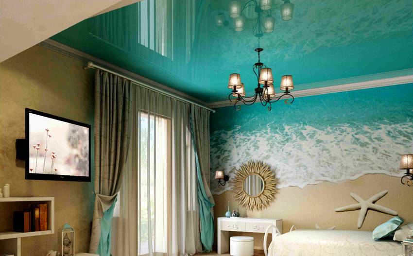 Красивым решением будет потолок с фотопечатью. Самым популярным вариантом является «звездное небо», которое, в основном, устанавливают в спальне и детской комнате. Скрытая подсветка также часто используется для оформления потолка. Она может иметь различные очертания. Благодаря глянцу свет преломляется, что делает интерьер необычным.