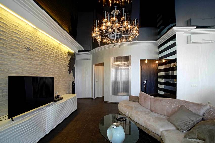 Для гостиной лучше подбирать глянцевые полотна светлых оттенков. Благодаря этому помещение будет казаться светлее и просторнее. Особенно, если предусмотреть подсветку. Если комната большая, то можно установить гипсокартонный короб, который покрывается глянцем. Можно сочетать сразу несколько подходящих цветов конструкции.