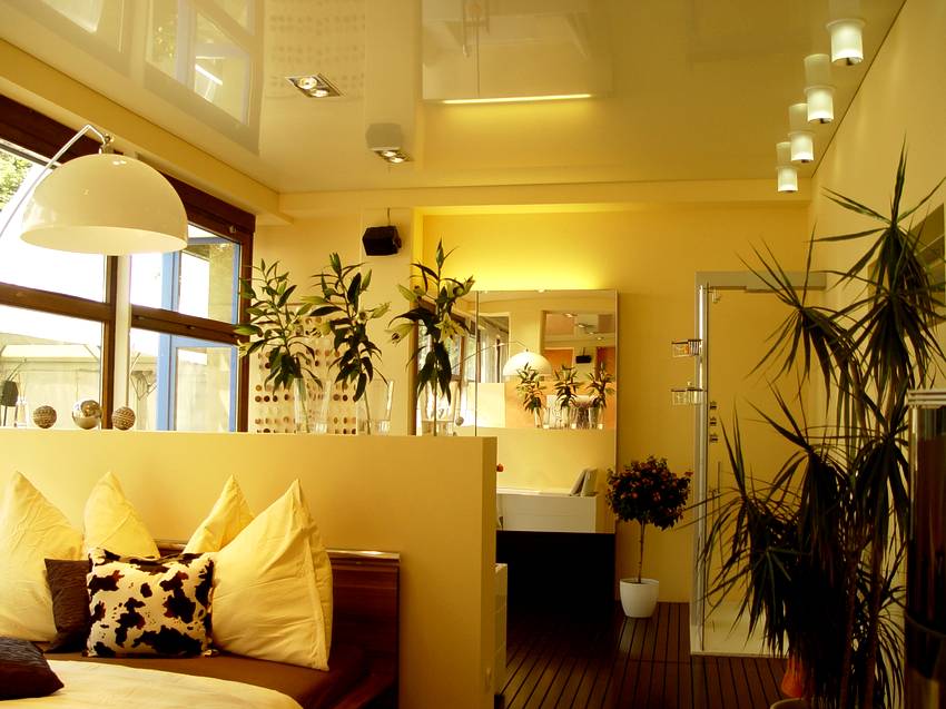 - С точки зрения дизайна глянец над головой делает потолок более стильным.