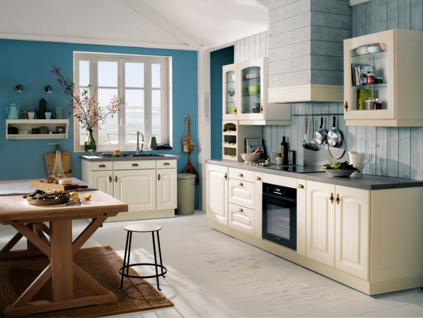 Синий цвет хорошо сочетается с деревом. Гармонично смотрится горизонтальная отделка стен, где низ оформлен деревянными панелями, а верх – синими обоями. Органично впишутся в интерьер кухни изделия с ненавязчивым узором. Это может быть горошек, мелкий цветочек или бело-синяя клетка. Хорошим решением является однотонная отделка стен, которая сочетается с яркой и насыщенной облицовкой фартука.