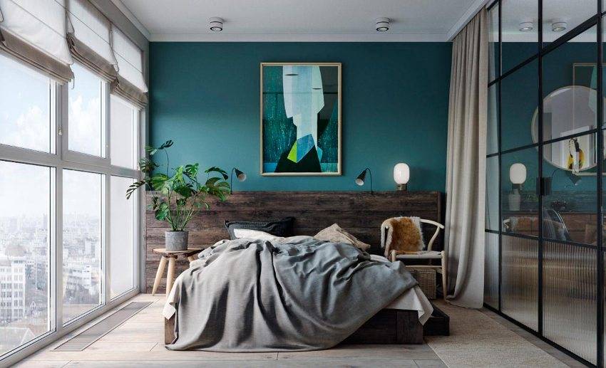 Голубая спальня заиграет новыми красками, если дополнить интерьер серебристыми или стеклянными элементами. На фоне бирюзовых стен будут неплохо смотреться белый и серый спальный гарнитур.