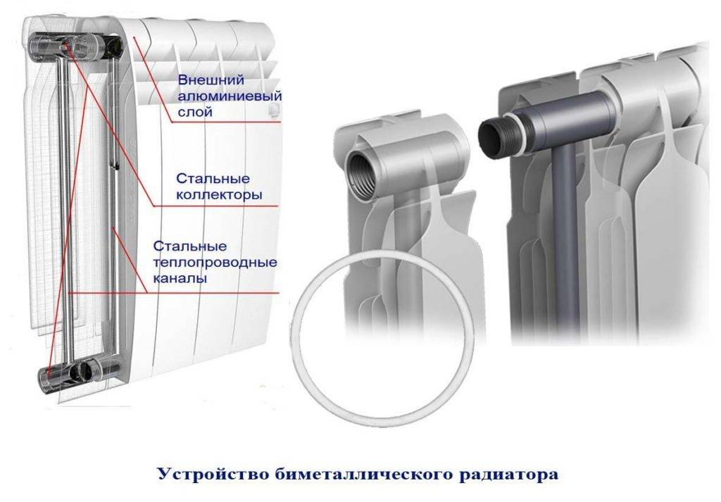 Чтобы устранить недостаток химической нестойкости алюминия к примесям в воде, были разработаны биметаллические радиаторы. Внешне это точно такой же алюминиевый радиатор, но внутри установлена стальная труба. Обычно используется два тройника на каждой секции и один ставится снизу, а другой сверху. Конструкция делается неразборной, чтобы повысить тепловую отдачу, уменьшив зазор.