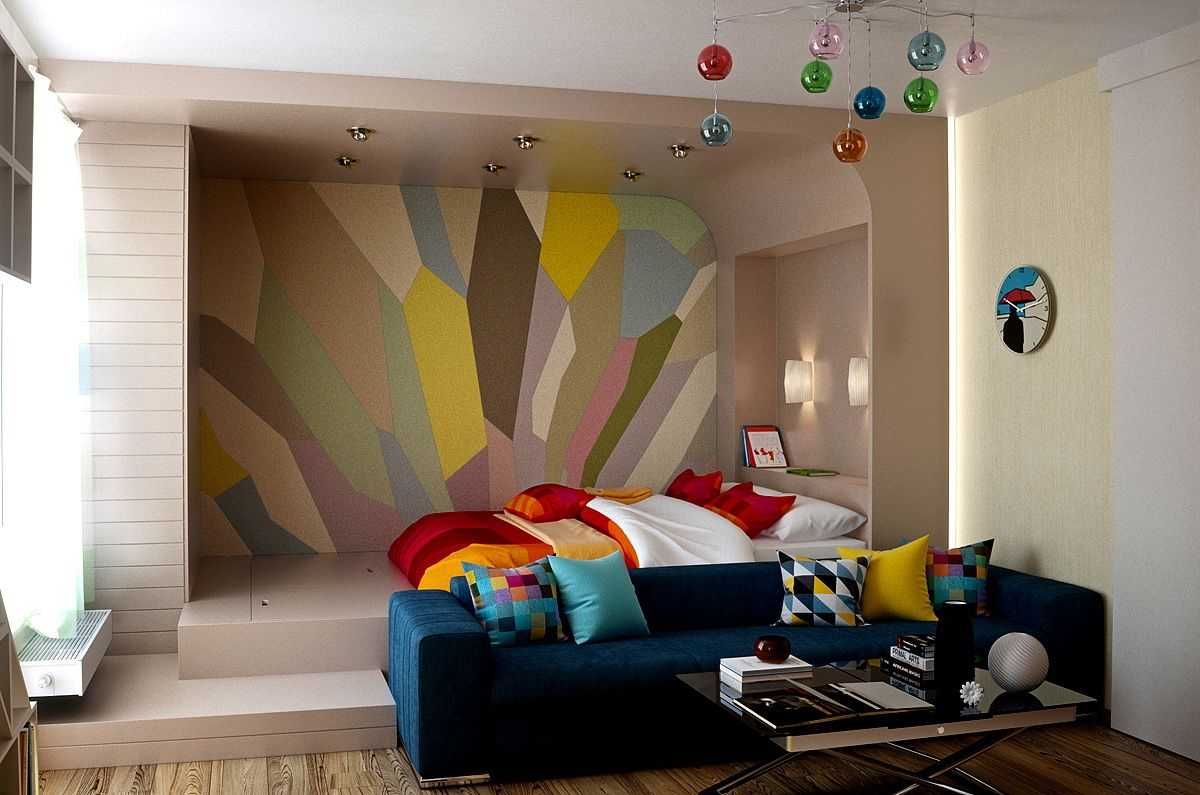 В проекте комнаты, на фото выше, кровать размещена сразу за диваном на невысоком подиуме. Стены и потолок вокруг спальни оформлены иначе, но главное – это яркий рисунок, который является главным акцентом всей комнаты. С одной стороны, дизайнер хотел показать таким образом, отдельность спального места, с другой, яркие элементы оформления являются частью общего дизайна гостиной. Функцию главного разделителя в данном случае выполняет диван.