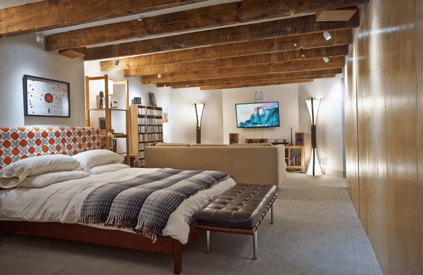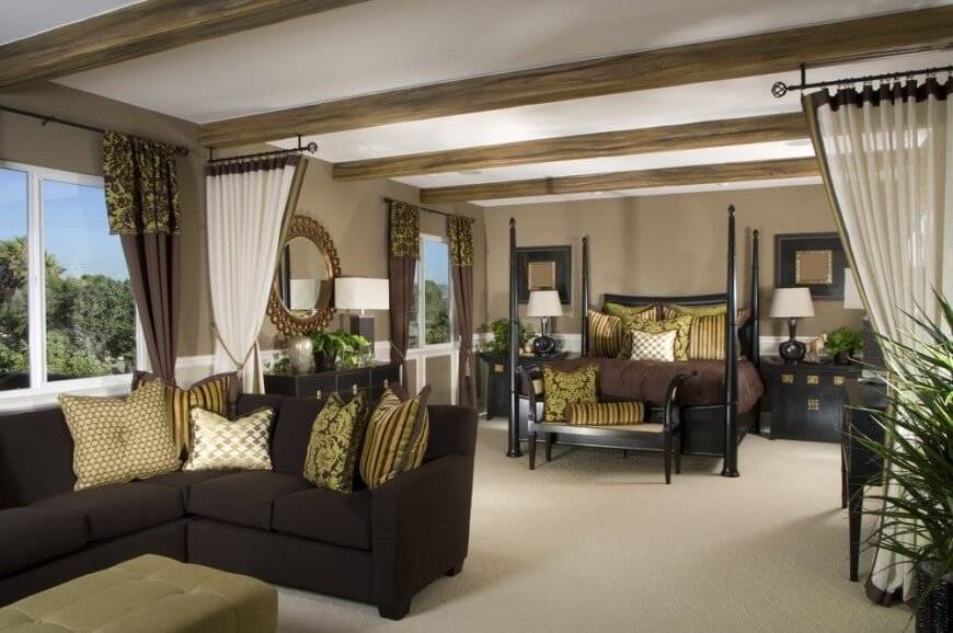 Гостиная, совмещенная со спальней, не будет выглядеть громоздко в таком интерьере, так как его стилистика предполагает применение разнообразных способов зонирования.
