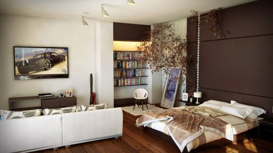 В таком случае спальная зона может вмещать диван и шкаф, а прочая зона ограничиваться телевизором, журнальным столиком и кроватью.