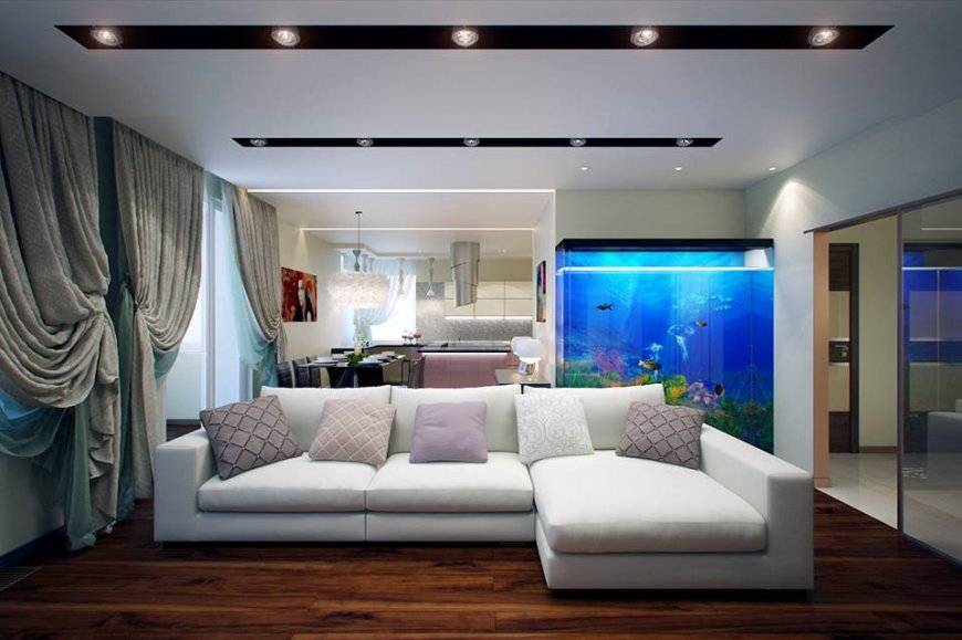 В этом случае необходимо уделить особое внимание выбору мебели, дизайну и освещению гостиной. Вы можете создать видимость двух отдельных пространств, используя грамотный выбор цвета