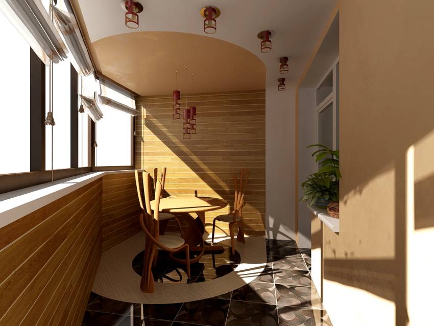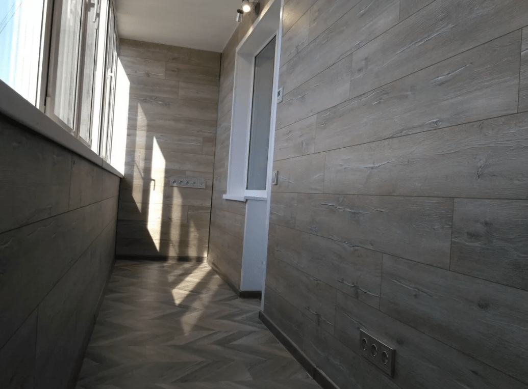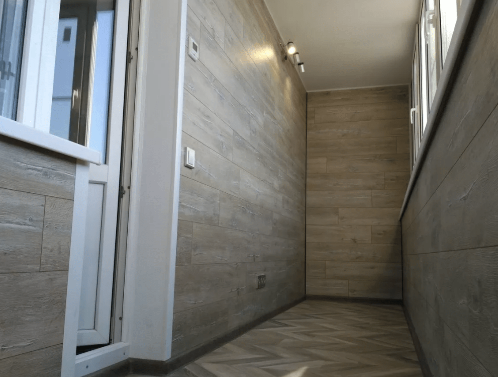 При отделке внутреннего пространства балкона ламинированными панелями создаётся имитация под разные материалы: