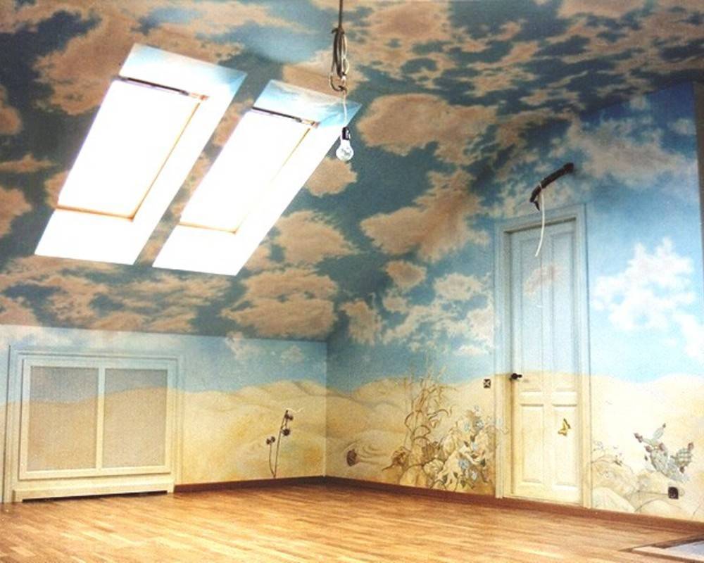 При помощи обычной краски, к примеру, акриловой, можно создать орнамент, который будет украшать гостиную либо спальню. Если дом выполнен из бруса либо обшит внутри деревянными панелями, стоит нанести рисунок на деревянные листы, а после прикрепить их к стене в нужном месте.