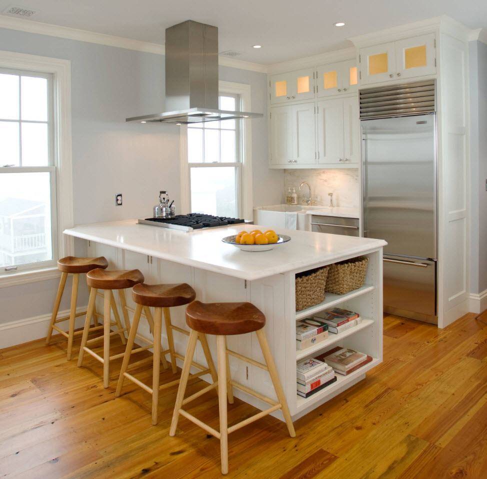 - Барная стойка. Вместо стола часто используют барную стойку. Она может стать отдельной частью меблировки или продолжить линию рабочей поверхности. Основное требование к такой конструкции – легкость. Она не должна быть слишком широкой и массивной, идеальный цвет – светлой древесины. Под барным столиком можно разместить стеллажи с полками.