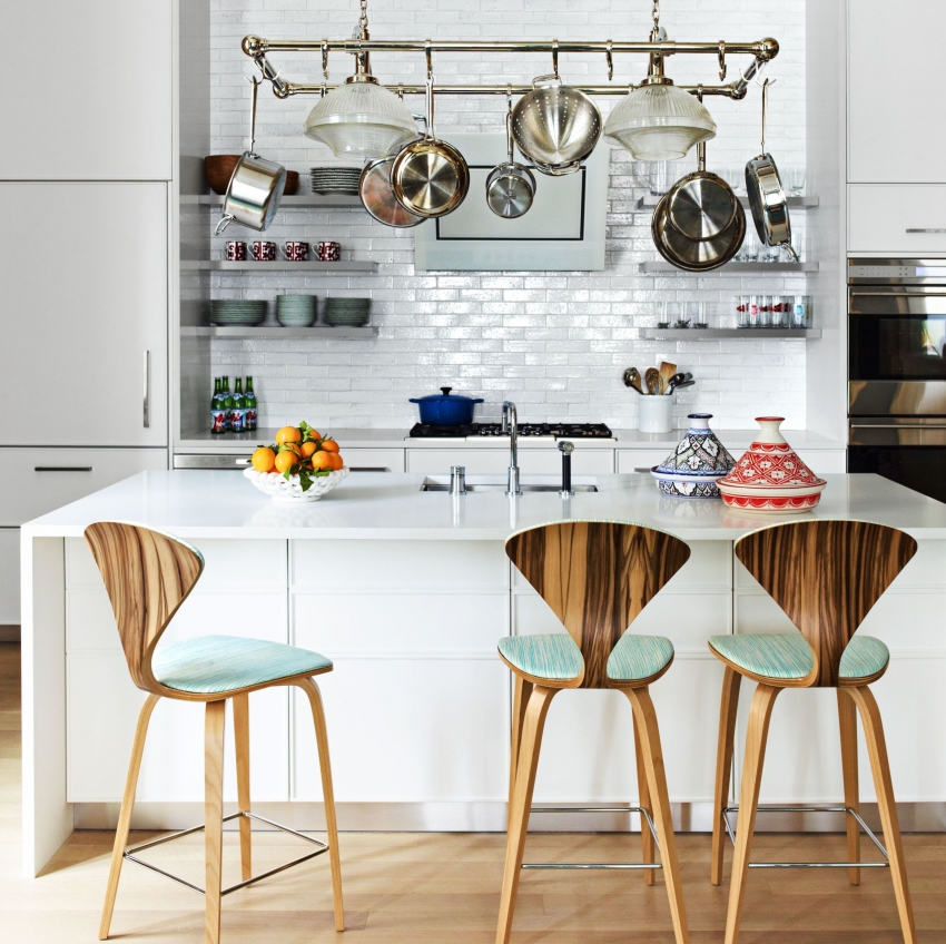 Дополнительное место для хранения на маленькой кухне можно обеспечить, установив держатель для кастрюль и сковородок над рабочим столом