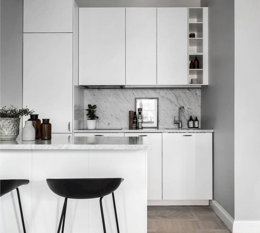 Белый цвет визуально расширит пространство небольшой кухни. Не стоит бояться его маркости, поскольку современные материалы позволяют легко очищать поверхности при помощи обычной влажной губки. Чтобы разбавить такую немного стерильную обстановку, можно использовать несколько акцентов, мебель или отделочные материалы с ярко выраженной текстурой. Белый цвет прекрасно подходит для создания интерьера в любом стиле.