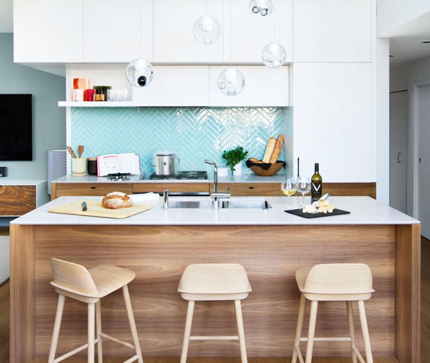 В первую очередь требуется сочетание функционального и атмосферного освещения. Установите подвесные светильники над обеденным столом и лампы накаливания под верхними шкафами.