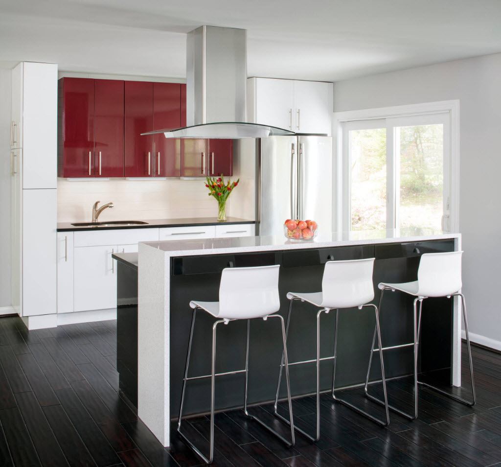 Если стерильный белый или тёплый сливочный цвет не для вас, то присмотритесь к красной кухне. Это не значит, что всё в помещении должно быть в агрессивных, «кровавых» тонах. Уместно будет смотреться такой кухонный гарнитур на сером или белом фоне, с контрастным фартуком или фасадами со вставками другого цвета.