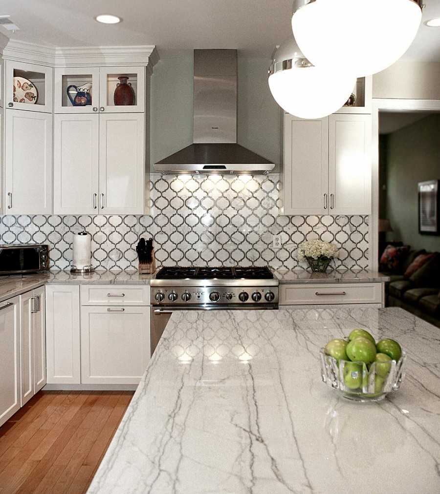 Яркий кухонный фартук, контраст столешницы с дверцами, стильные аксессуары хорошо впишутся в квадратную кухню.