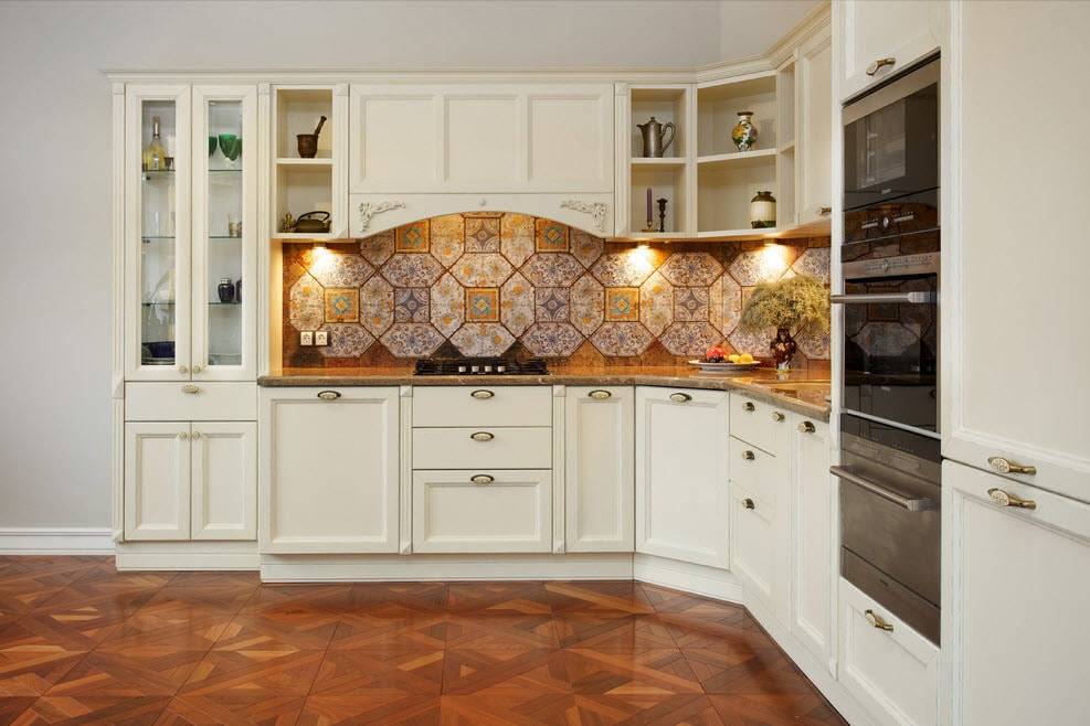 - Пол. В кухне постоянно происходят активные действия по приготовлению пищи и мойке посуды. Это может сказаться на внешнем виде покрытий, включая поверхность пола. Учитывая эти моменты, не рекомендуется использовать: — ламинат (от влаги его швы могут деформироваться); — деревянные материалы (впитывают жидкости и жирные пятна, плохо переносят чистку химическими средствами); — керамическая плитка эконом вариант (остаются сколи после случайного падения предметов). Лучше всего будет сделать керамогранитное покрытие или воспользоваться надёжной прочной плиткой.