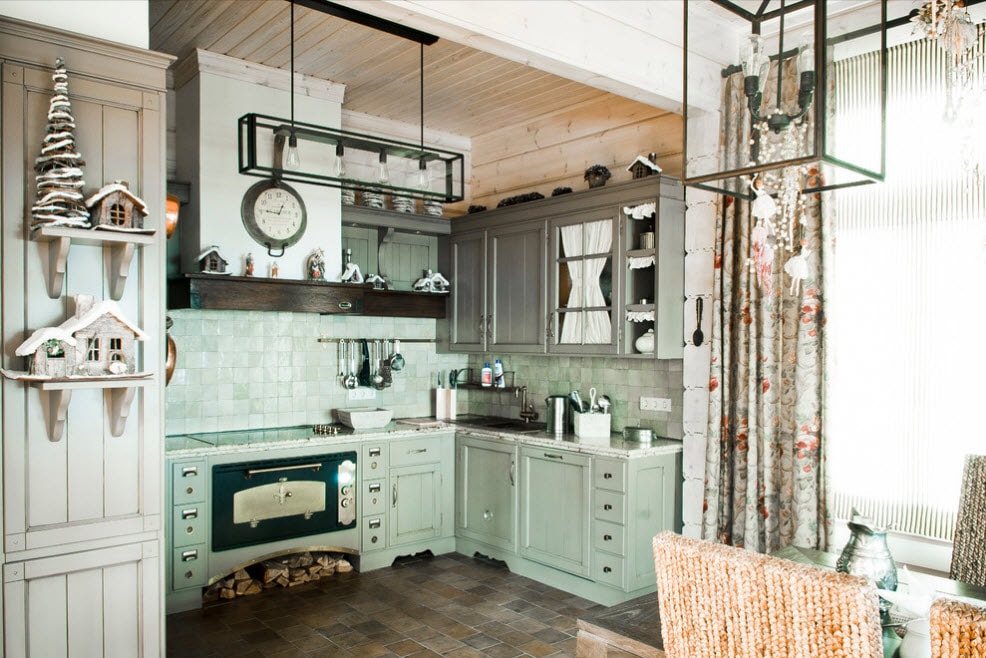- Для кухни в коттедже, построенном из дерева, лучше всего подходят деревенские интерьеры – кантри и прованс. Можно выполнить стилизацию под русскую избу или дворянскую усадьбу, а любители нежной романтики оценят шебби-шик.