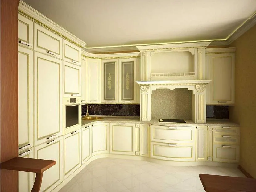 Обустройство классической кухни не предусматривает правил. Здесь нет насыщенности, яркости и вычурности. В организации кухонного пространства используются натуральные материалы. Дизайн фасада мебели имеет интересное оформление с позолотой и красивой изящной фурнитурой.