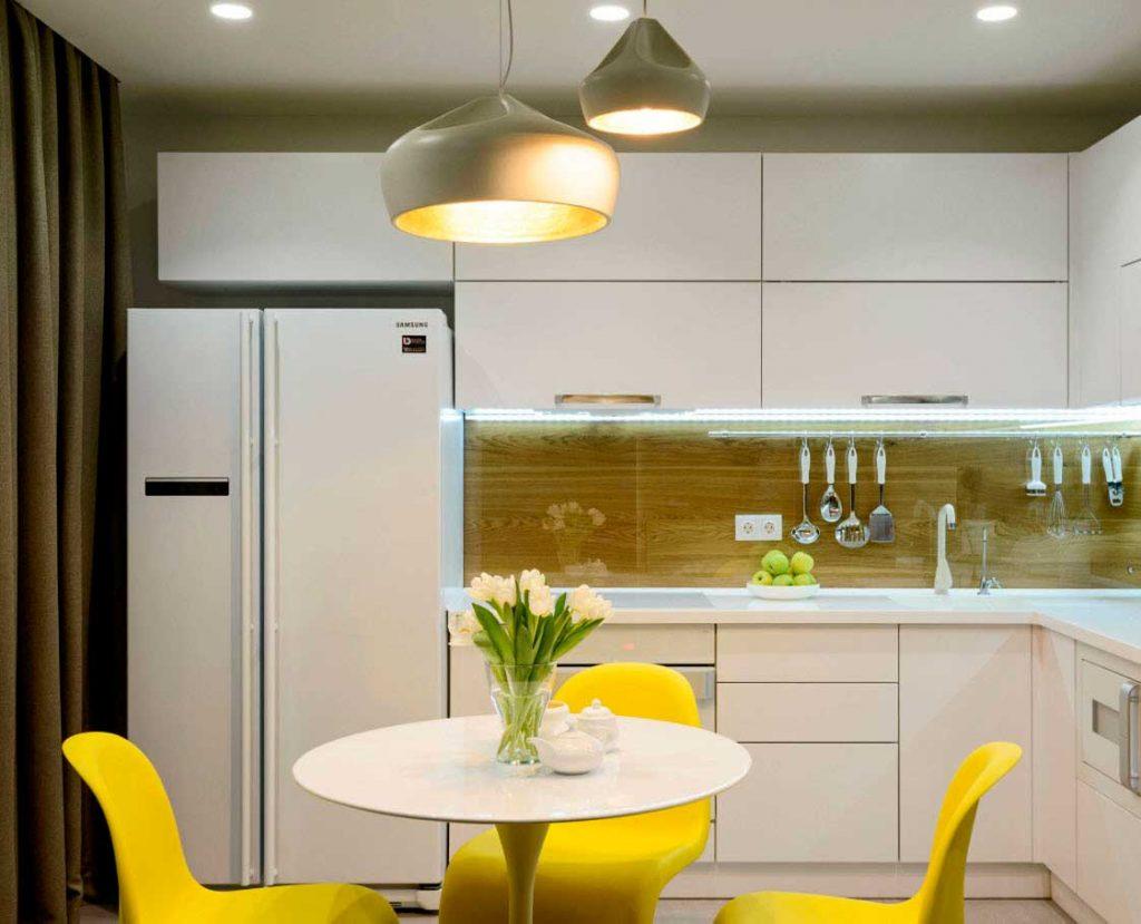 Кухня в светлом интерьере с искусственным правильным освещениемИсточник skedraft.ru