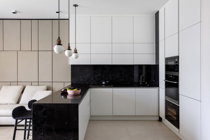 Если этого не делать, чёрного цвета в интерьере должно быть немного (к примеру, только пол и фартук).