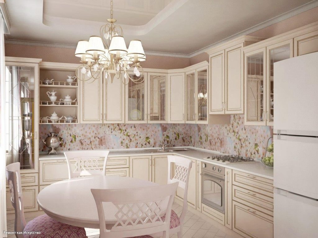 Этот стиль является более изящным. Для него характерно использование натуральных материалов: дерево, керамика, стекло. Кухонный гарнитур может иметь резные фасады и винтажную фурнитуру. Также приветствуется большое количество декоративных элементов: миленькие горшочки с цветами, винтажные люстры, цветастые занавески. Резные стулья для обеденного стола тоже будут очень кстати для такого интерьера.