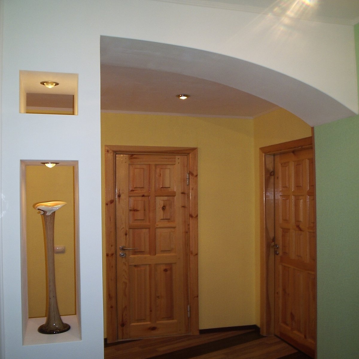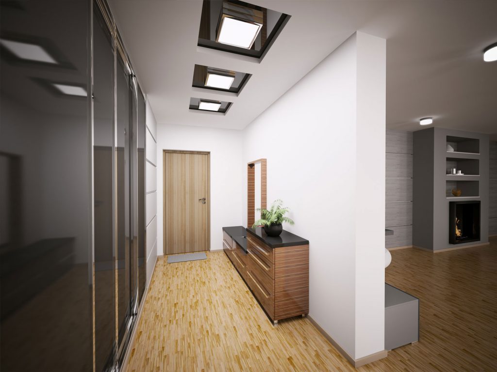 Оснащение потолка хорошим освещением выгодно увеличит высоту потолка в вашем маленьком коридоре.