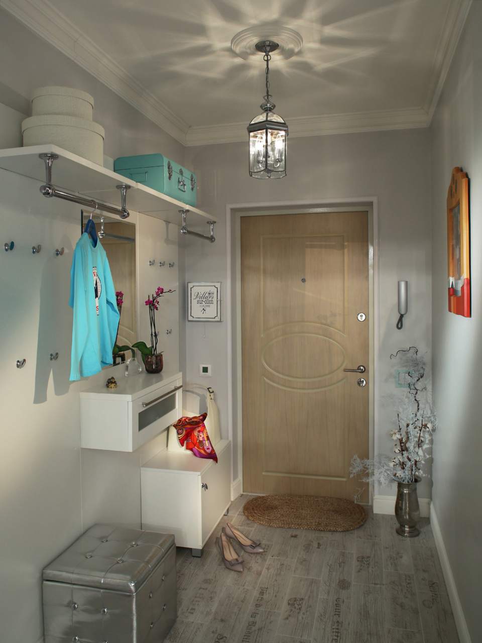 Как можно меньше декора и массивных деталей, громоздкой мебели. Только вешалка, небольшая структурная обувница. Можно поставить узкий шкаф, который по высоте едва касается потолка.