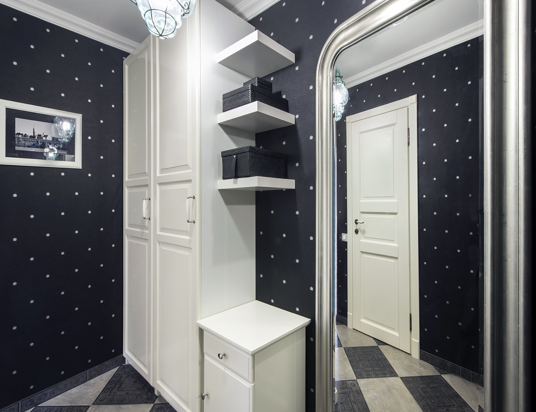 На фото интерьер квартиры с коридором, оборудованным небольшой кладовкой.