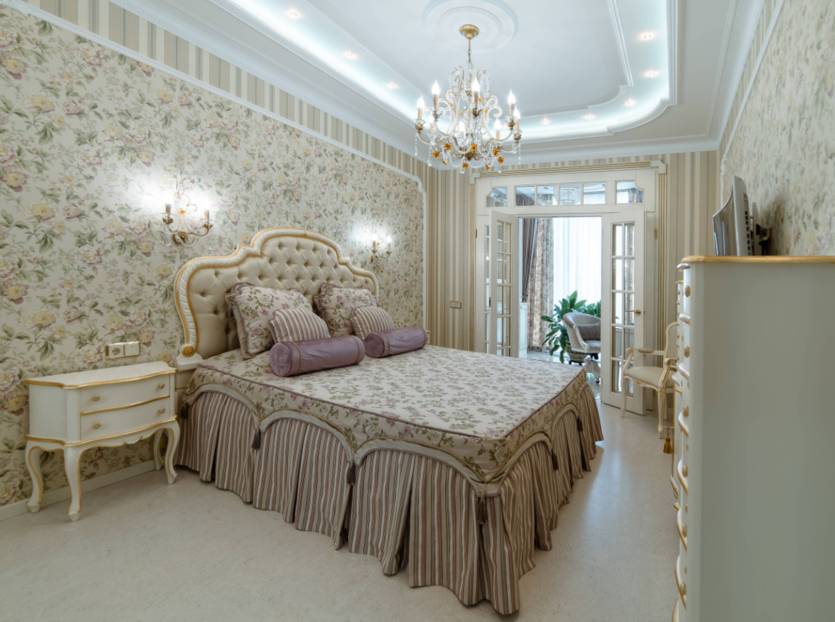 Интерьер спальни с двумя видами обоев в классическом стиле