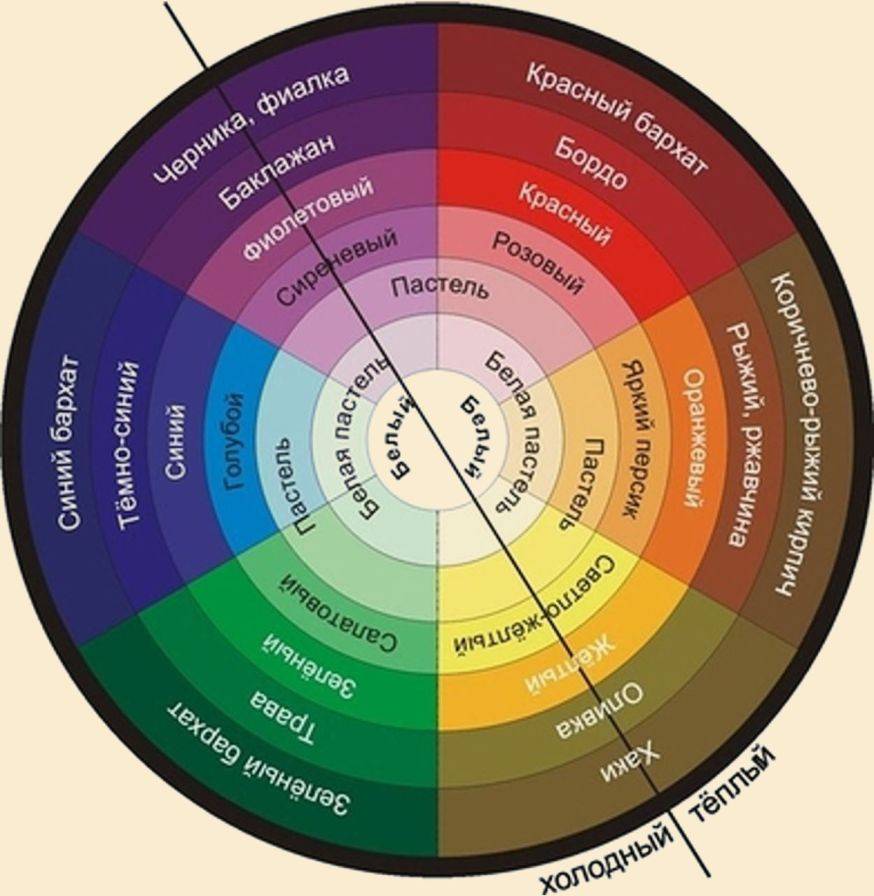 Цвета с преобладанием красного, желтого и оранжевого тонов ― холодные, а с преобладанием сиреневого, синего и голубого ― теплые. Нейтральные цвета, содержат равное количество и тех и других, например зеленый (синий и желтый) и фиолетовый (желтый и синий).