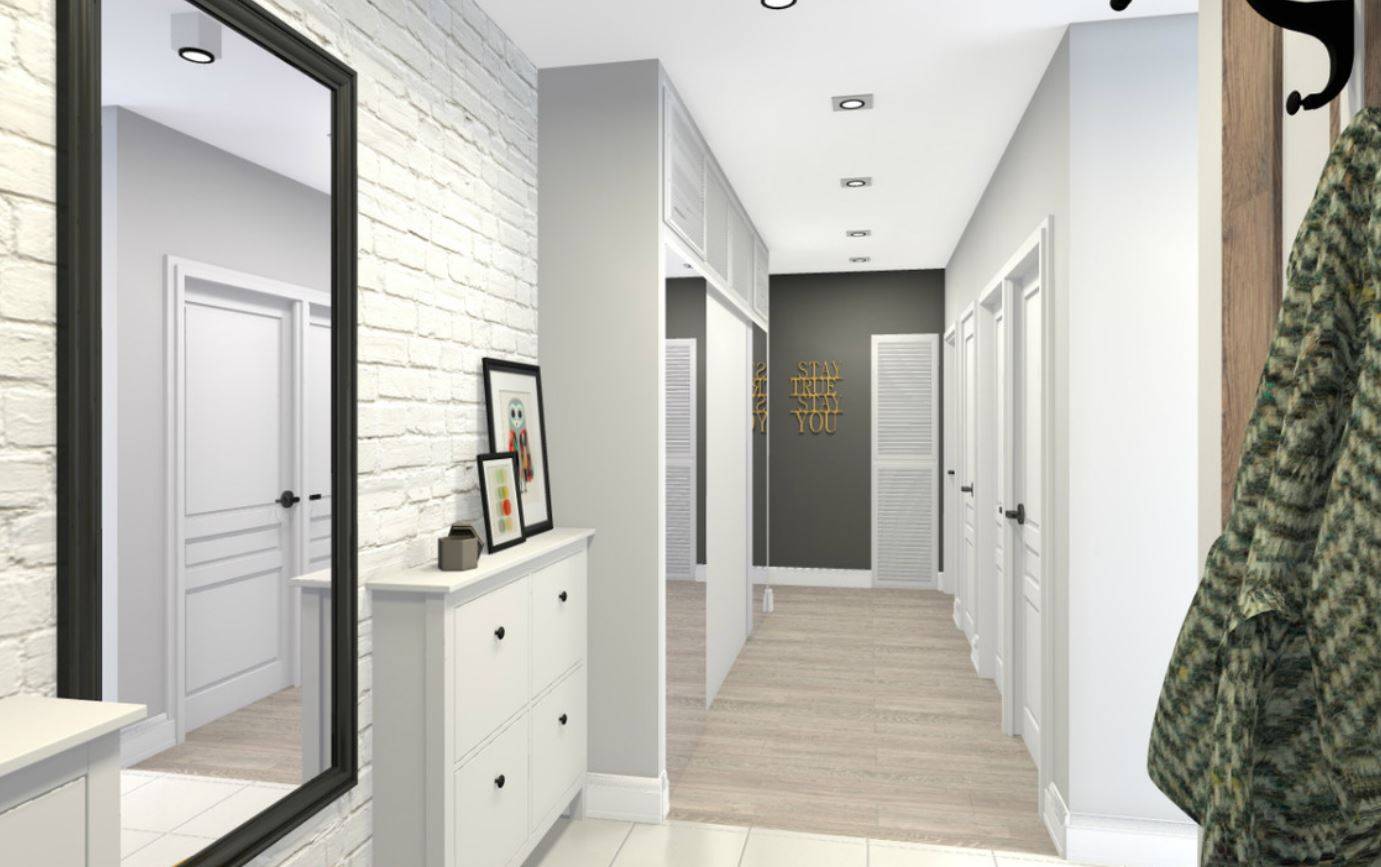 Главный недостаток — отсюда хорошо видны все комнаты в квартире. Чтобы решить эту проблему, нужно закрыть дверь каждой из комнат. Наиболее распространенный способ перепланировки коридора такого типа — разделение его на две функциональные зоны.