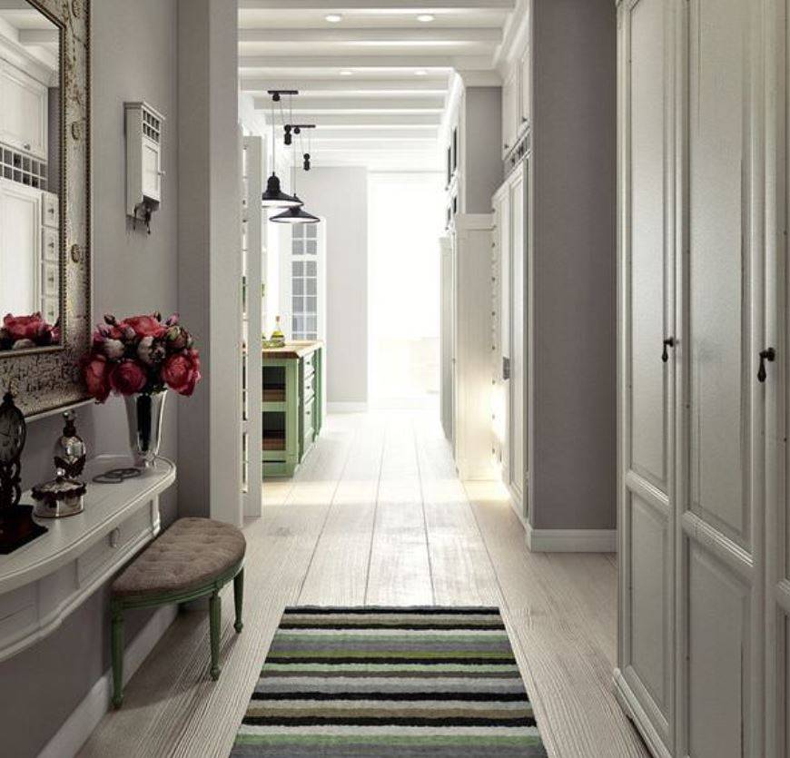 Если коридор длинный и узкий, лучше разделить его на две зоны. Один из них будет служить коридором, второй — холлом. Создавать зонирование пространства можно с помощью разных отделочных материалов. Подходящим покрытием для зоны у входа будет плотный линолеум, а для холла — паркет или ламинат.