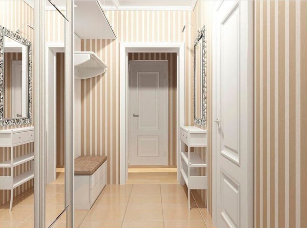 Встроенный шкаф с зеркалом, вертикальные обои и светлая палитра играют на расширение пространства