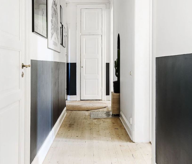 - если нижняя часть стен окрашена или оклеена в тёмные тона, можно оформить пол в совсем светлом цвете, даже если он будет светлее стыка стен.