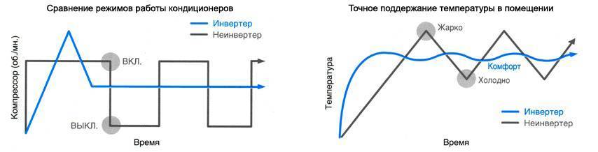 В инверторных кондиционерах реализована система плавной корректировки мощности кондиционирования, в зависимости от температуры в помещении. Входящий в состав устройства инверторный силовой блок позволяет понижать или повышать частоту переменного тока, тем самым влияя на скорость вращения двигателя компрессора. Кондиционер работает на полную мощность только при первом включении, чтобы температура в помещении максимально быстро достигла установленного значения. Затем обороты двигателя снижаются, и компрессор работает в режиме поддержания заданной температуры, а не отключается полностью, как в случае с обычным кондиционером.